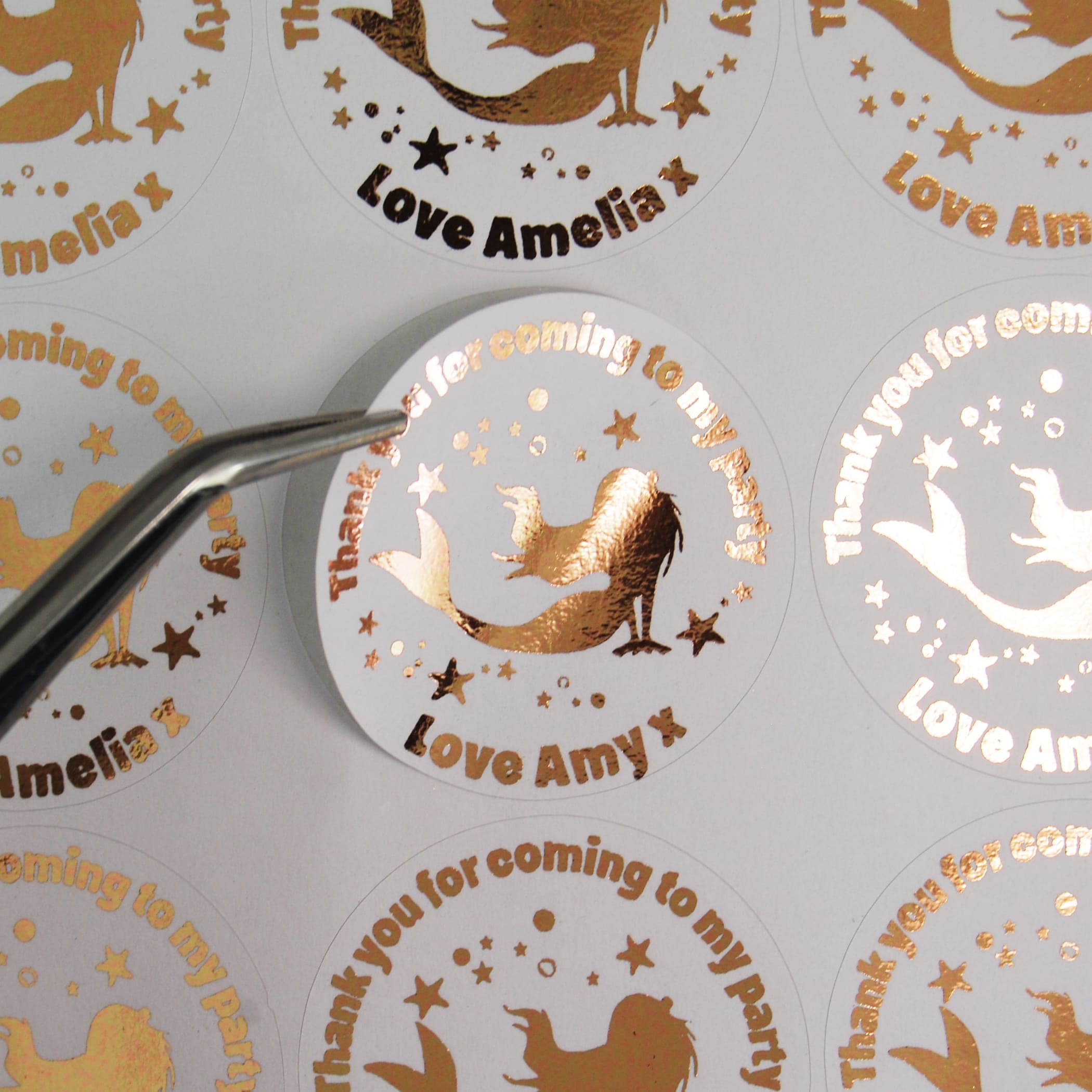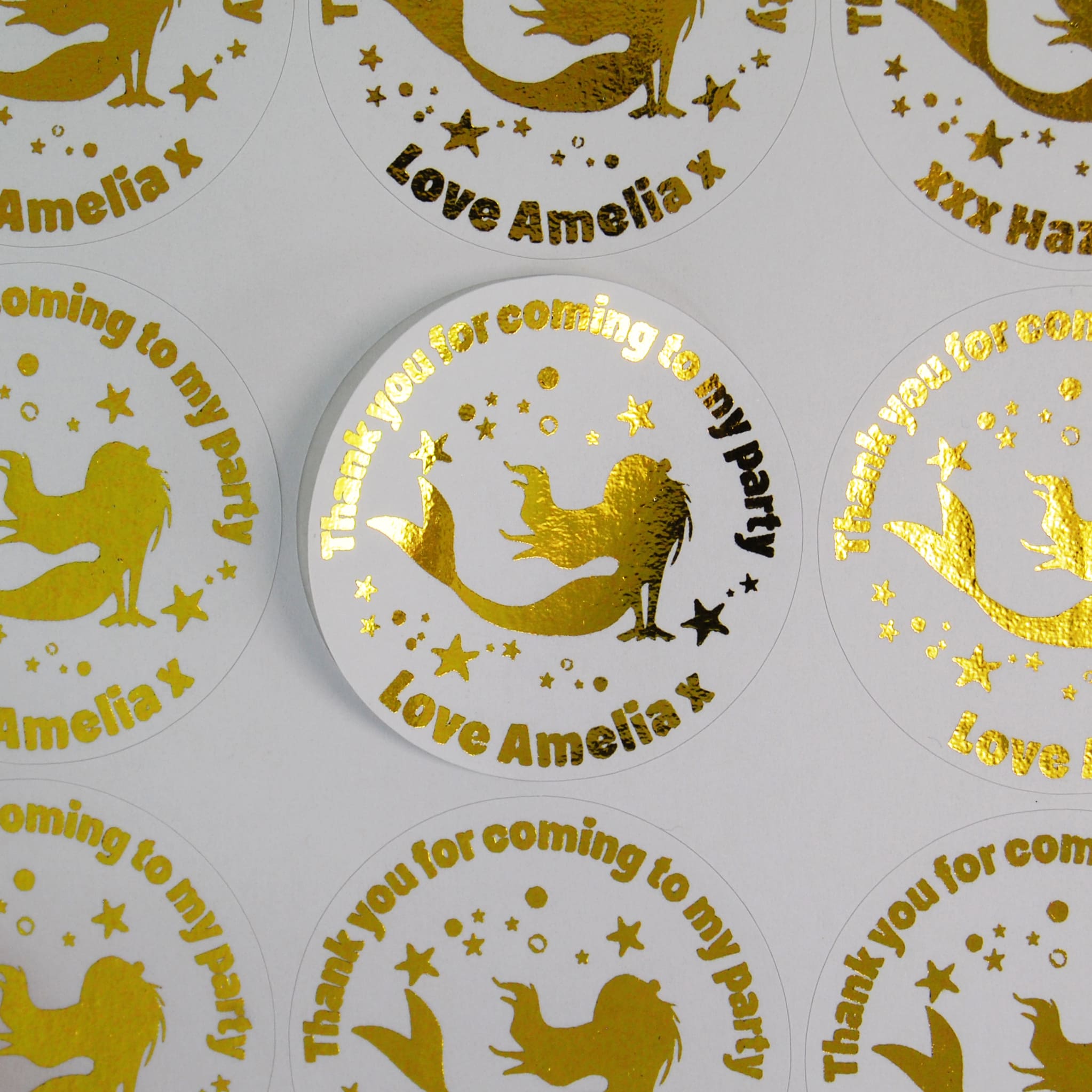 Material: Quality paper stickers with strong adhesive backing and a foil print finish on the front