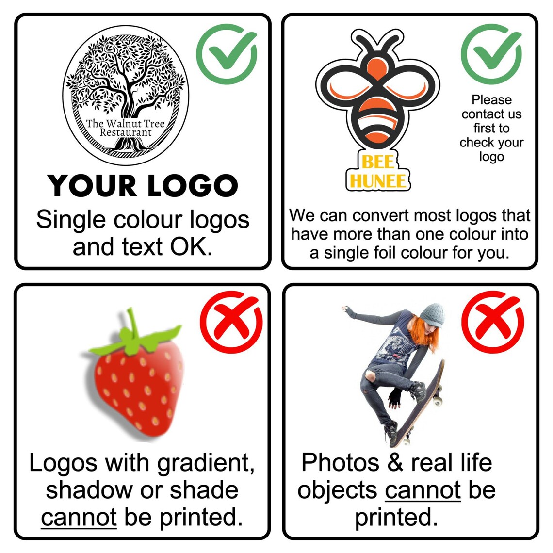PLEASE NOTE: The Logo/Image you upload must be a SOLID colour. Please see guideline and example in Product Photos.