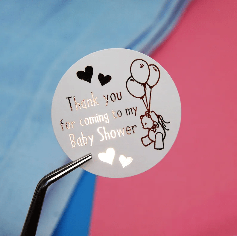 The “Thank You for Coming to My Baby Shower” stickers feature a sweet teddy bear holding balloons, surrounded by hearts. Perfect for party favours or gift bags, these high-quality stickers add a cute, heartfelt touch to baby showers.